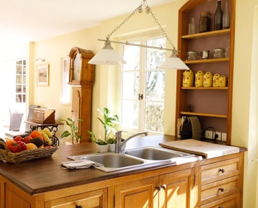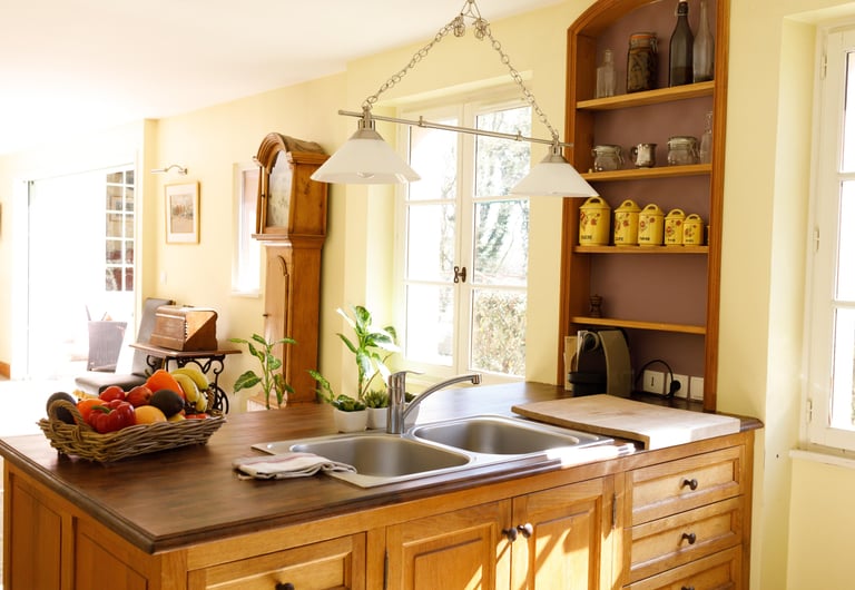 Une grande cuisine entièrement équipée, agrémentée d’une buanderie et d’une arrière cuisine pour la logistique.